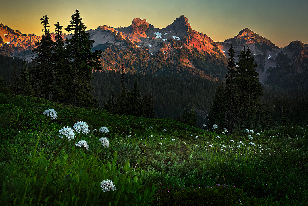 2. Eye travel - first my eye catches the big white flowers in left bottom. They are excellent eye catcher! And my eye follow the light in the foreground and frame out in the mid right unfortunately. It is difficult to come back to the frame, although it has beautiful mountain peaks.