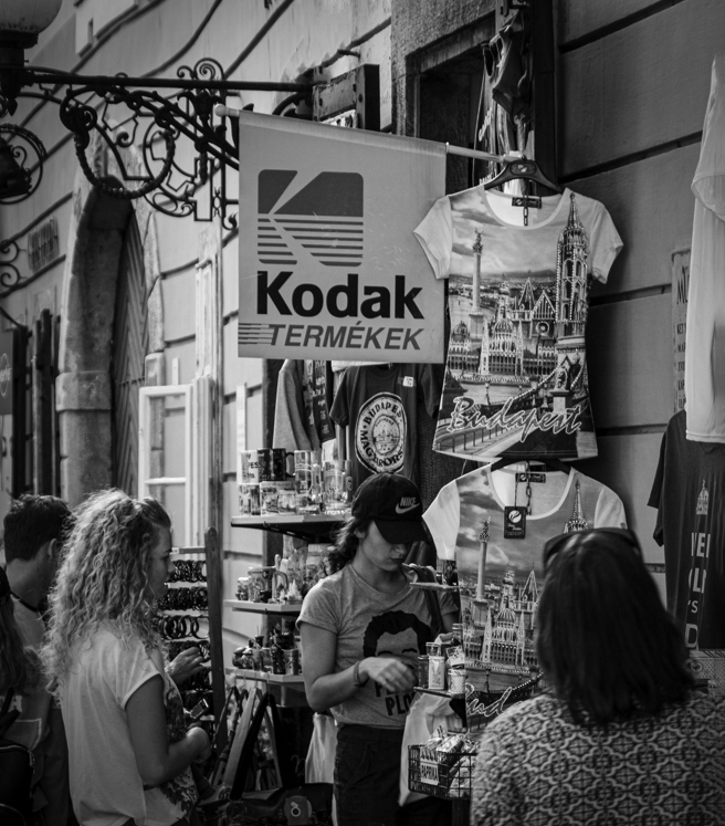 I don't have much experience as a street photographer, but I do have a suggestion. I cropped the image to eliminate body parts from being cut off (girl's feet and other girl's right arm). I also tried to focus on the three main images and the Kodak sign, so I applied a slight vignette. |