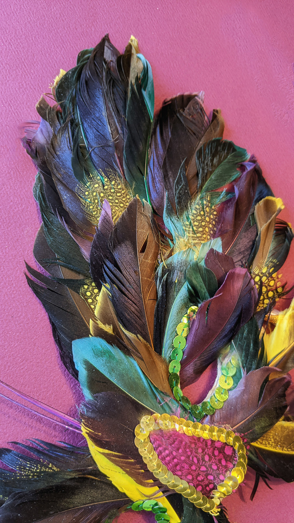 The colors and tones of the feather mask against the pink background is lovely. You captured nice details on the mask. The yellow sequins add punch to the image. Nicely done.