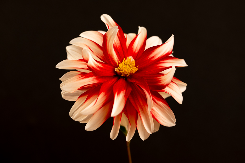 Beautiful! This red beauty has strong impact. You captured the fine details perfectly. It appears that the dahlia is emerging from the darkness at the bottom of the frame. The dew drops are incredible. Love it! It deserves to be framed. |