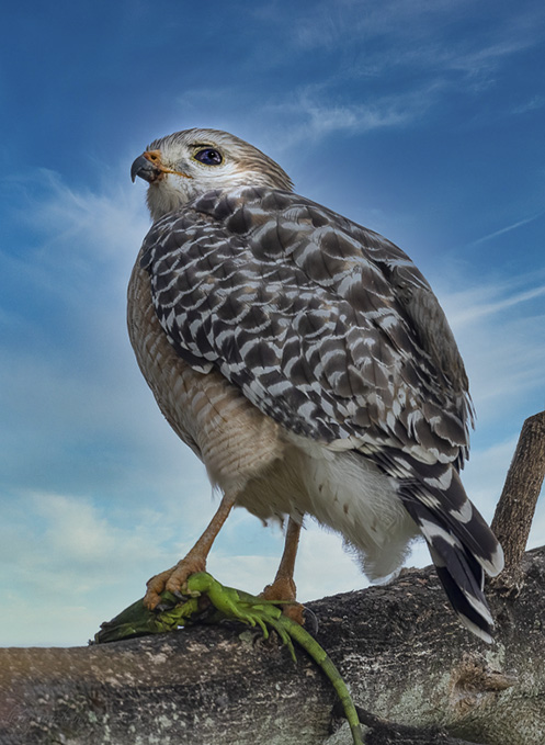 Great capture. Love the catch light in the eye and excellent cleaning and cropping of the background. I tried lightening the overall image with a touch more contrast and selective dodging of the face. I especially like a slight lightening of the face. On the first of edits I did not change the background and on the second which what shows I added a Luminar sky. It may be more than you like. |