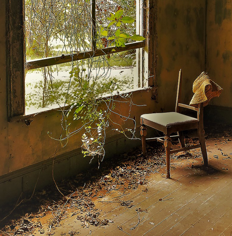 I agree with all the comments above. But the energy I see is the interplay between the living plants invading the window and the old chair inside. The crop that I think magnifies this conflict maintains the wonderful textures of the walls and the chair, although the outside plants are invading their space. |