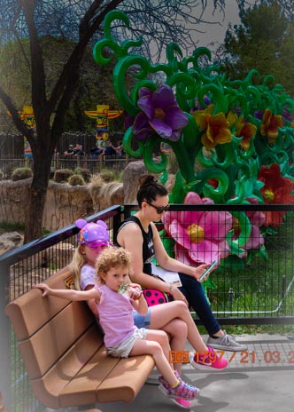 I like the interaction of the children with the photographer while the mom focuses on her phone. While I believe the main subject(s) are the people, the flower sculpture keeps drawing my eyes away from the people to the sculpture and thus overwhelms the scene. While it is an interesting aspect to the photo you might consider toning it down and lightening the children/mom on the bench. Edit attached may be too much but it does change look. B |