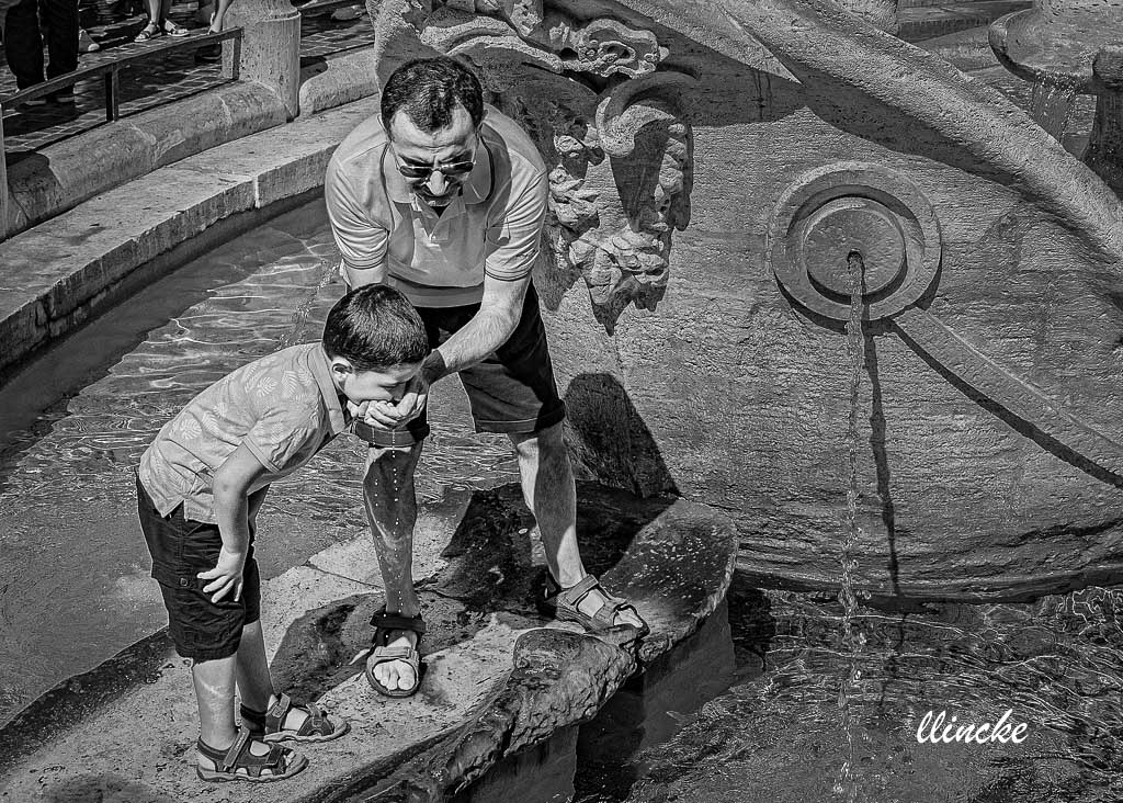 How sweet and refreshing. You were able to capture an intimate moment (guessing between a father and his son) in a public place. The photo is sharp though the bright light is harsh. Not sure if a B&W version reduces the harshness but I gave it a go. B |