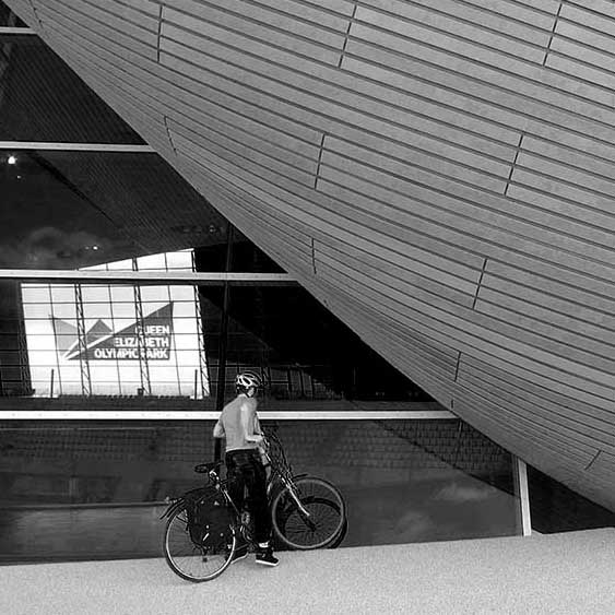 The cyclist really helps your image. As you state, it gives scale to the image and focuses the viewer in an interesting place in the frame. This is a high contrast image that may also work well in b&W with a slightly different crop. B |