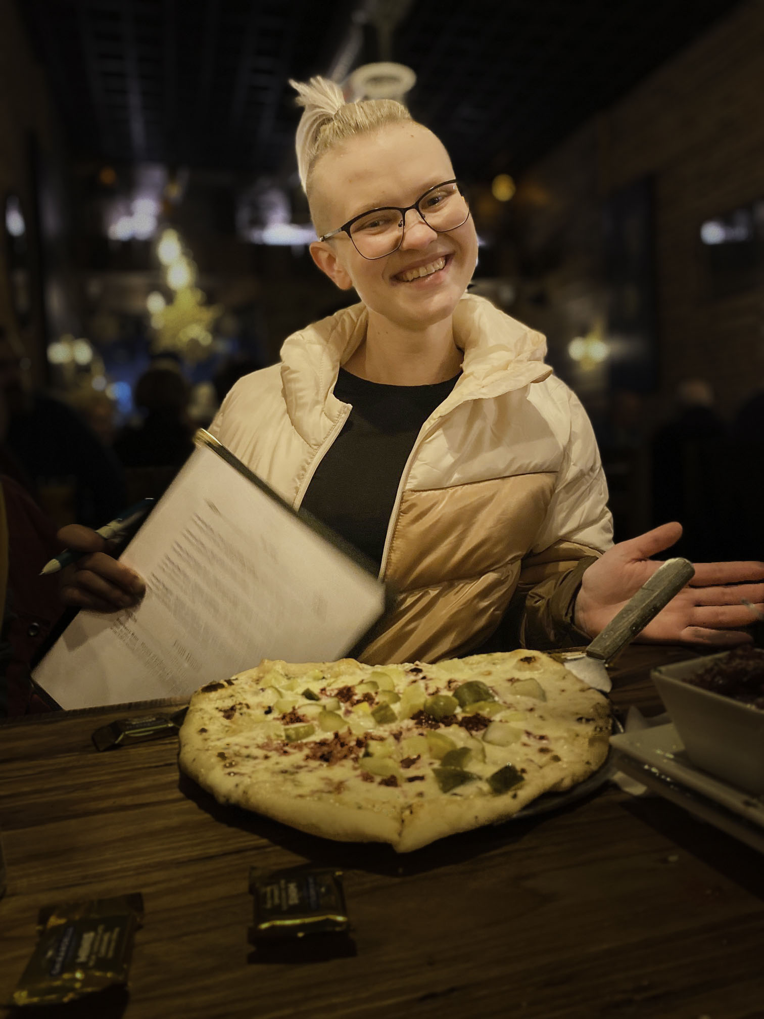 That looks good enough to eat, no less than to photograph! Without the explanation it looked like a heart to me. Nice capture of a fun moment with friends. You could probably lighten up Hannah and the pizza a bit with some masks and a radial filter and darken the background. Here's a quick edit using ACR. B |