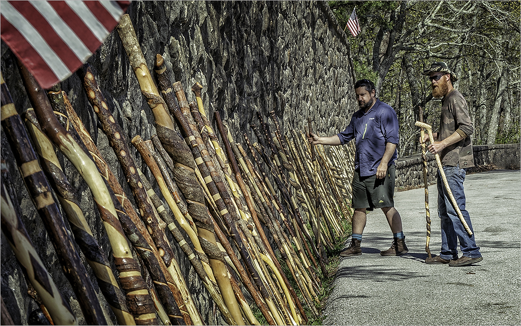 Glora - You did a great job telling the story of a prospective buyer selecting one of the many hiking sticks. I like how you were able to get all everything in focus as well. To me, the wall above the man in blue, the sticks below his arm, and the white tree branches are a bit bright. I took a stab at masking them slightly in ACR to reduce their brightness. B |