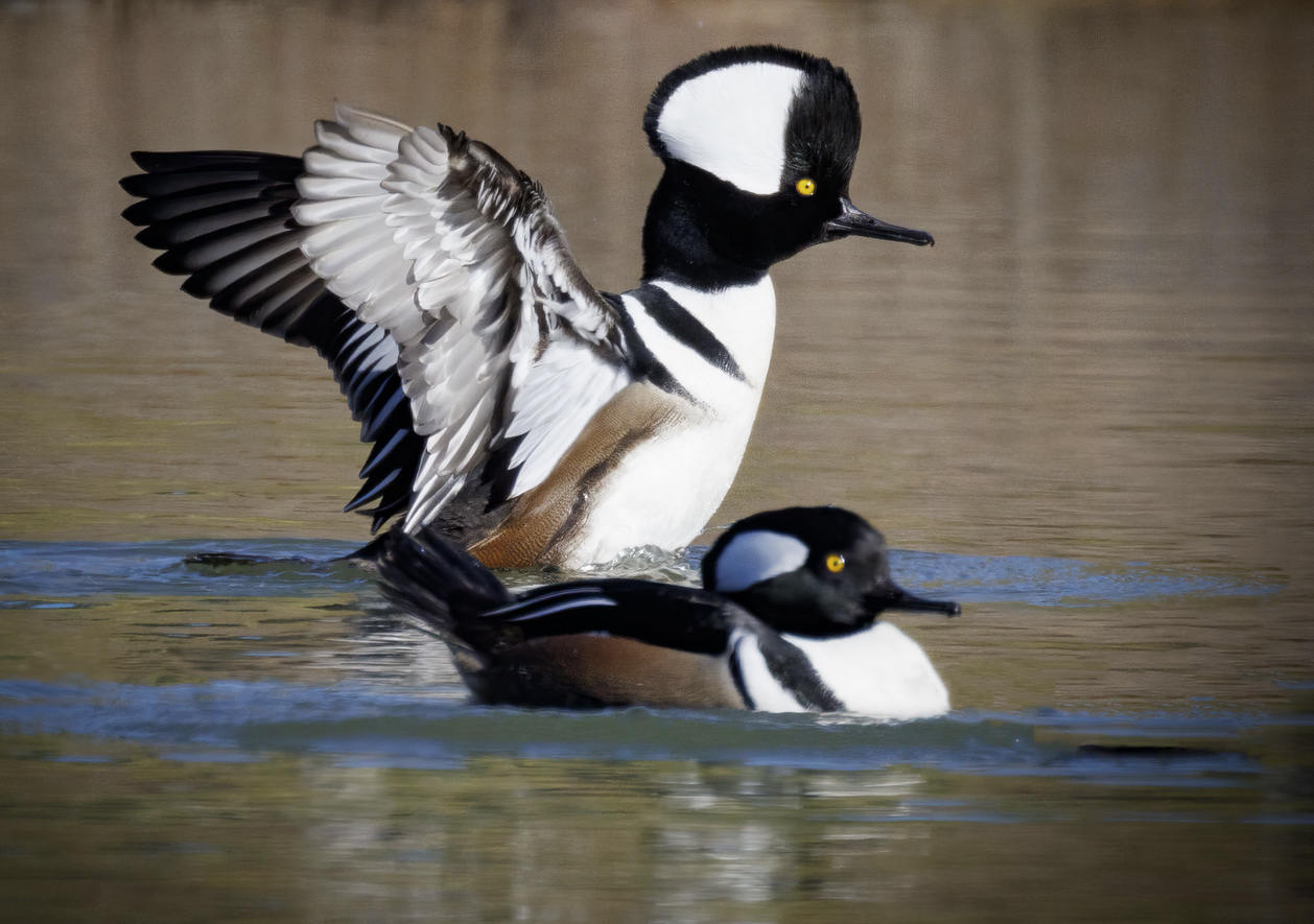 Hi Julia, nice picture of two Hooded Merganses in different positions. I took the liberty of changing the framing and cropping the background at the top and narrowing the crop to give the impression that there is more space on the right of the image. |