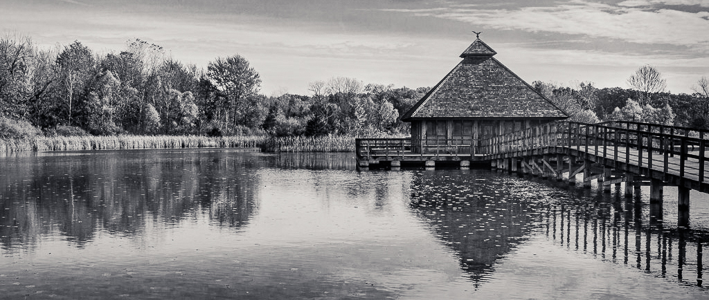 It is a nice image that seems to bring across the peace of a quiet Autumn day. I think the B&W works well, as there is interesting graphic form in the wooden structures, and tonalities in the B&W rendering of what must be multi-color trees.