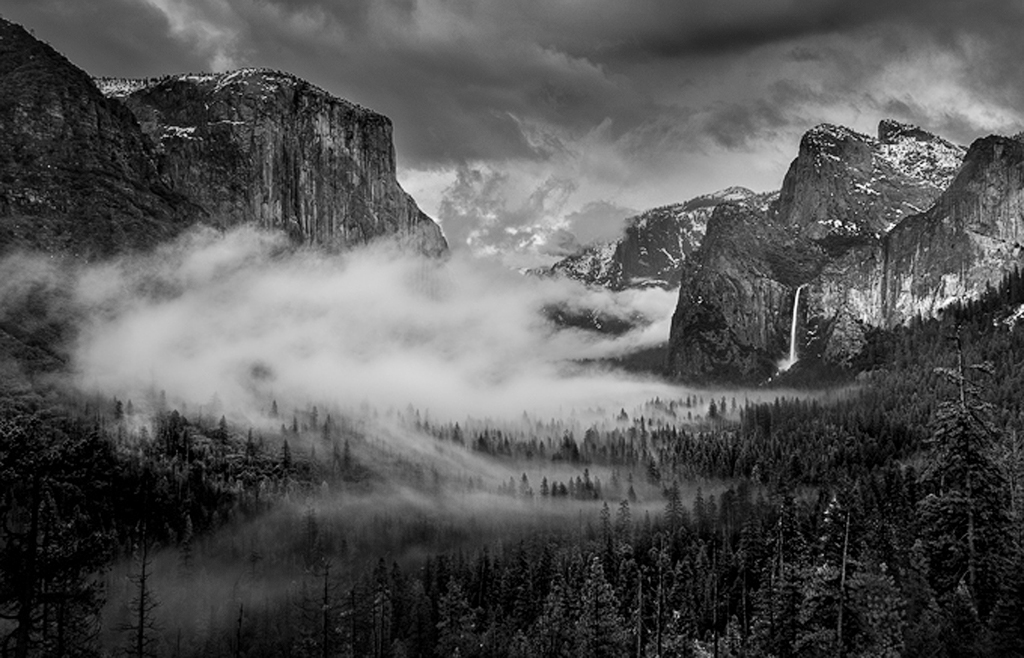 I'd say it was worth the effort though to manage this sort of spectacular weather conditions at Tunnel View. The B&W in particular is very impressive. I love the clouds flowing through the trees in the valley, as well as Bridal Veil Falls, which I suspect you've brightened to make really stand out. My only suggestion would be to crop more tightly to what I think is the interesting part - like below, where I also darkened the sky to hold the interest on the clouds in the valley.