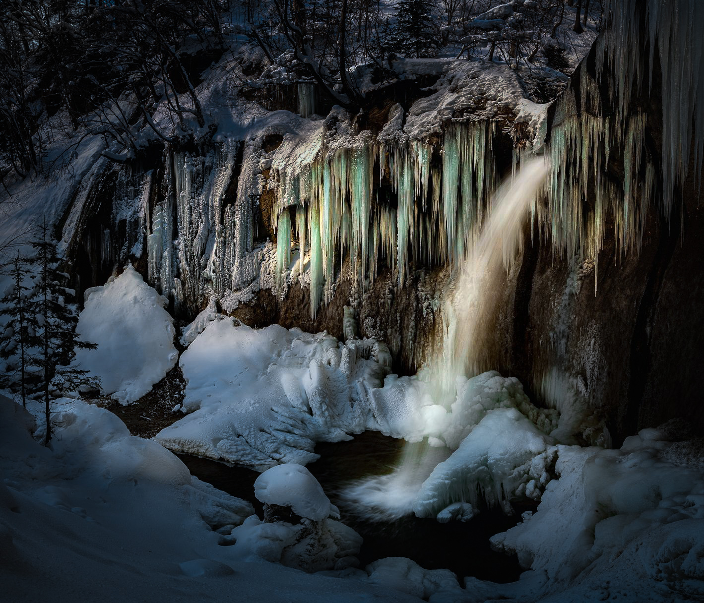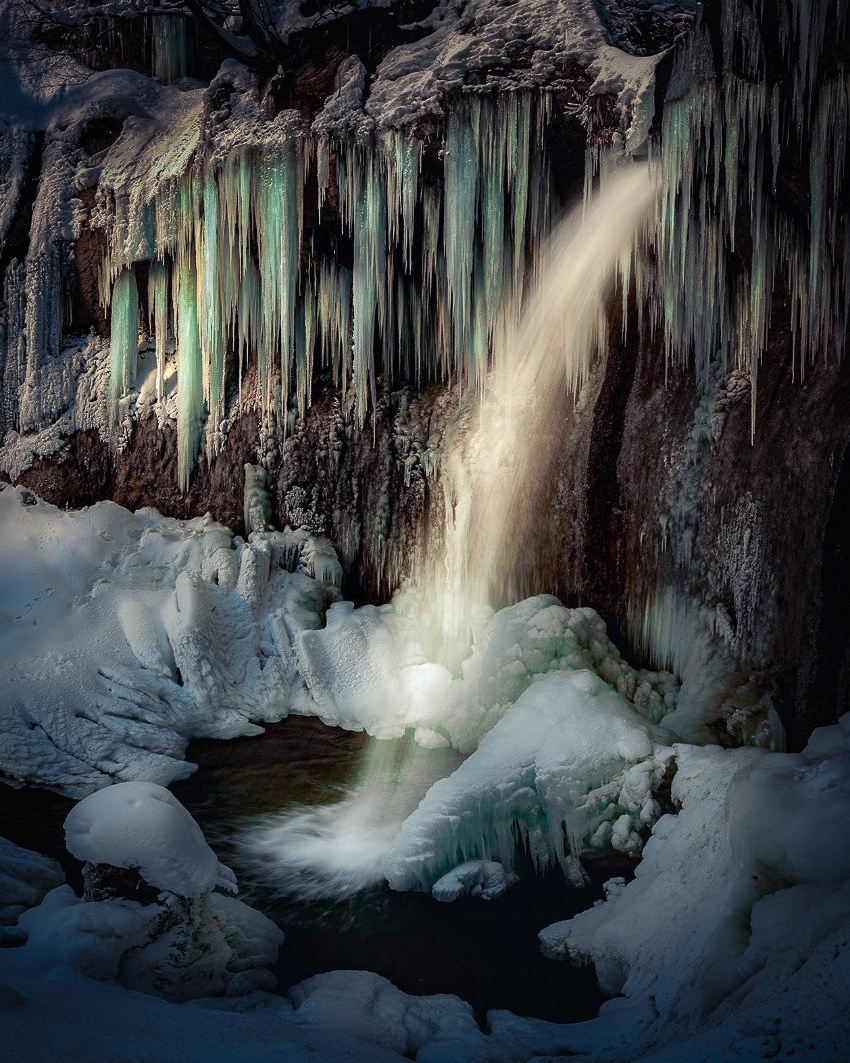Overall, the processing was to darken the image, the edges more so, and cool it down. I then did a bunch of dodge and burn to highlight the falls and icicles and make them warmer. I also played with the colors of the icicles to highlight them a little more. This was all a quick LR job vs what I would normally do in PS. And was probably heavy handed. But to me at least it shows this composition has potential.