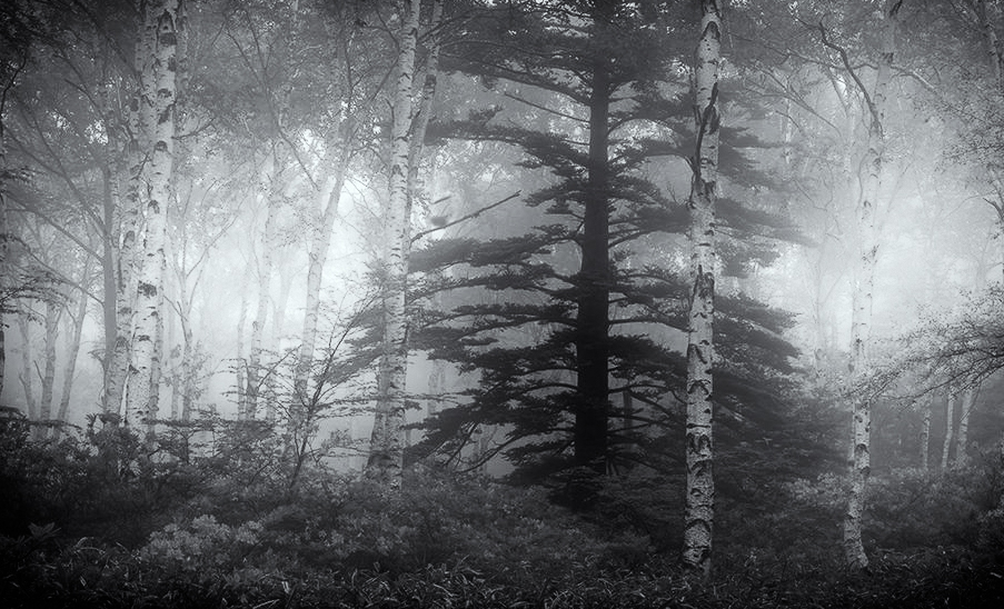 Hi Haru. I love the fact you provide us specific questions. It is very helpful in providing feedback. To your first couple - what do I see and what do I think the center of interest is - I start looking at the orange flowers which have the most visual contrast. The I shift to the brighter toned tree on the right. Eventually I get to the large, dark, partially fog covered tree near the center. If I had to pick a "focus" I think that would be it. It is the thing in this image that has more story - mystery, power, etc. - relative to the other trees and vegetation.