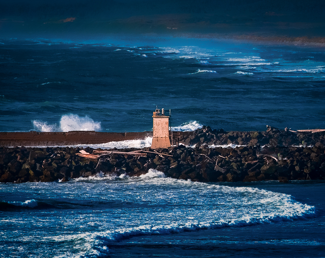 I also really like the leading line of the wave which sweeps from the front but leads right to the lighthouse. I also like the fact that the diagonal of that leading line at the end near the lighthouse is echoed (same diagonal angle) in the waves in the distance.