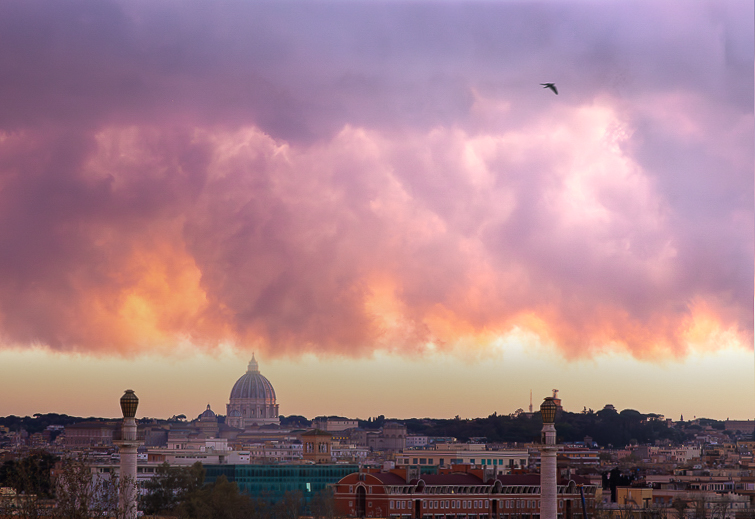 So I took a shot at some things to really make the image about the dramatic clouds in the center horizontal band. I straightened the image, enhanced the color separation in the clouds by bringing saturation up or down in individual colors, brought out the yellow warmth in the sky below the clouds, and then cropped in on all sides. Then I did a tricky thing in photoshop, namely I created a second version of the image, slid it down, and masked; this was to narrow the empty band between the clouds and cityscape. Finally, I chose a focus in the clouds in the upper right (near the bird), and brought up the light there and in that corner. That hopefully gives a definite focus for the image.