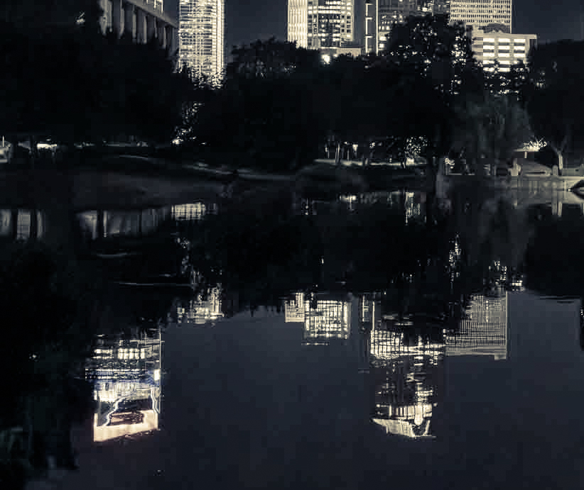 A couple of other suggestions. I might choose to not show the full extent of the buildings and their reflections. I might also choose to go with something a little more monochrome as the natural colors in this scene do not seem particularly harmonious. I played with it a little along those lines and came up with what is below. It is a little different look that you may like better or not.