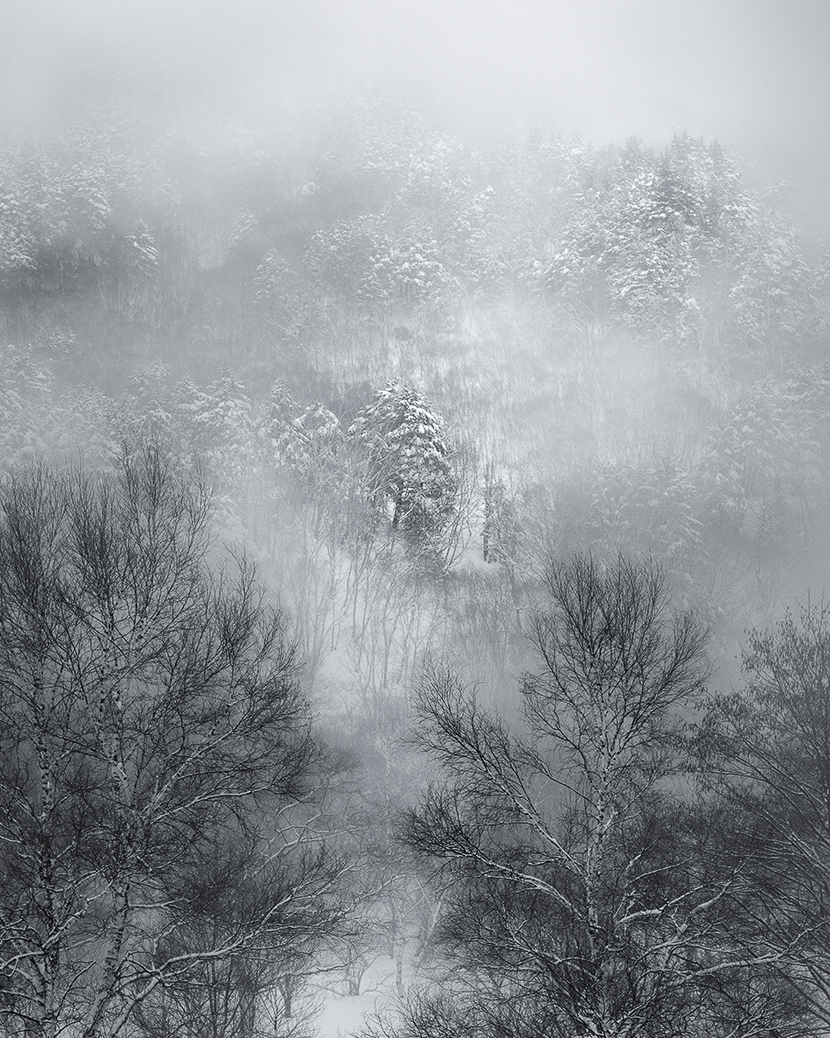 There are a couple of compositional aspects that for me don't work as well though. First, it is very left right symmetrical - two trees in front, two less obscured areas in the distance - and the symmetry makes it feel a little less natural. Two is a difficult number, so I'd also say the two trees in front also suffer a little from that. A little wider with three trees might be better. With the vertical format and the two trees up against the edges, there is also a tightness feeling to the image that fights a bit with the relaxed, soft, smooth feel that the atmospherics deliver. Finally, it seems to have been taken from a high position, so I feel a little like I am looking down. I am not sure why, but that feels a little odd.
