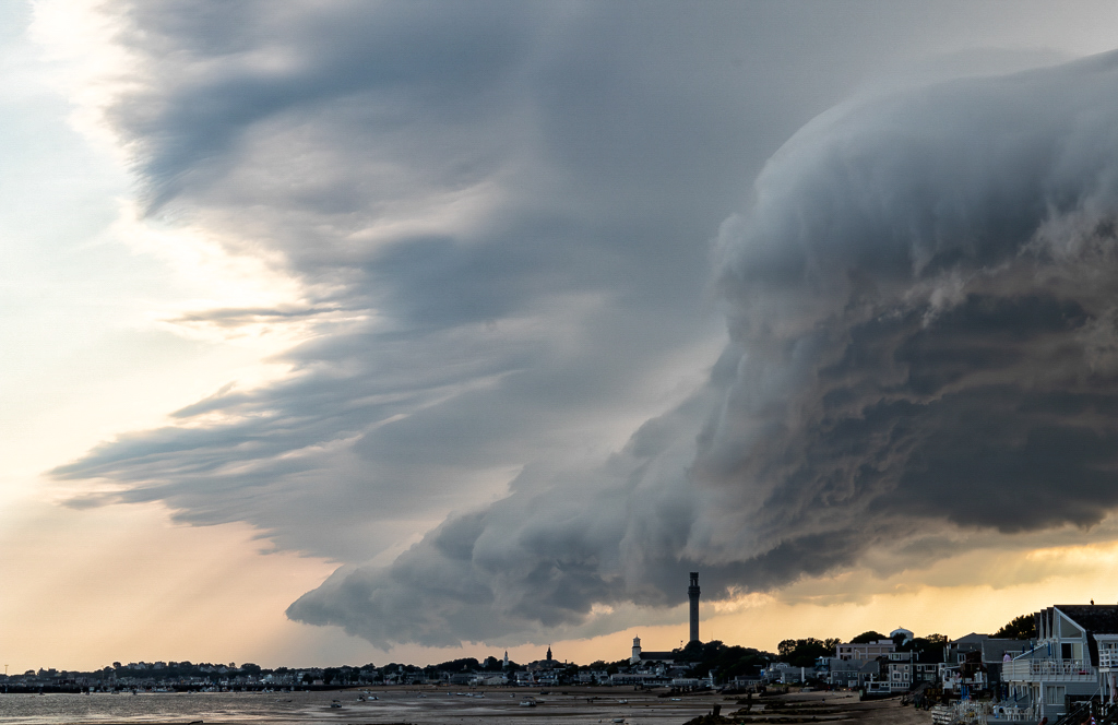 Others have commented on showing more land/sea at the bottom. To me, I think you have enough. The smaller sliver of land/sea further emphasizes the enormity of the clouds, and since the shoreline is fairly cluttered, I suspect that much more of it would become distracting.