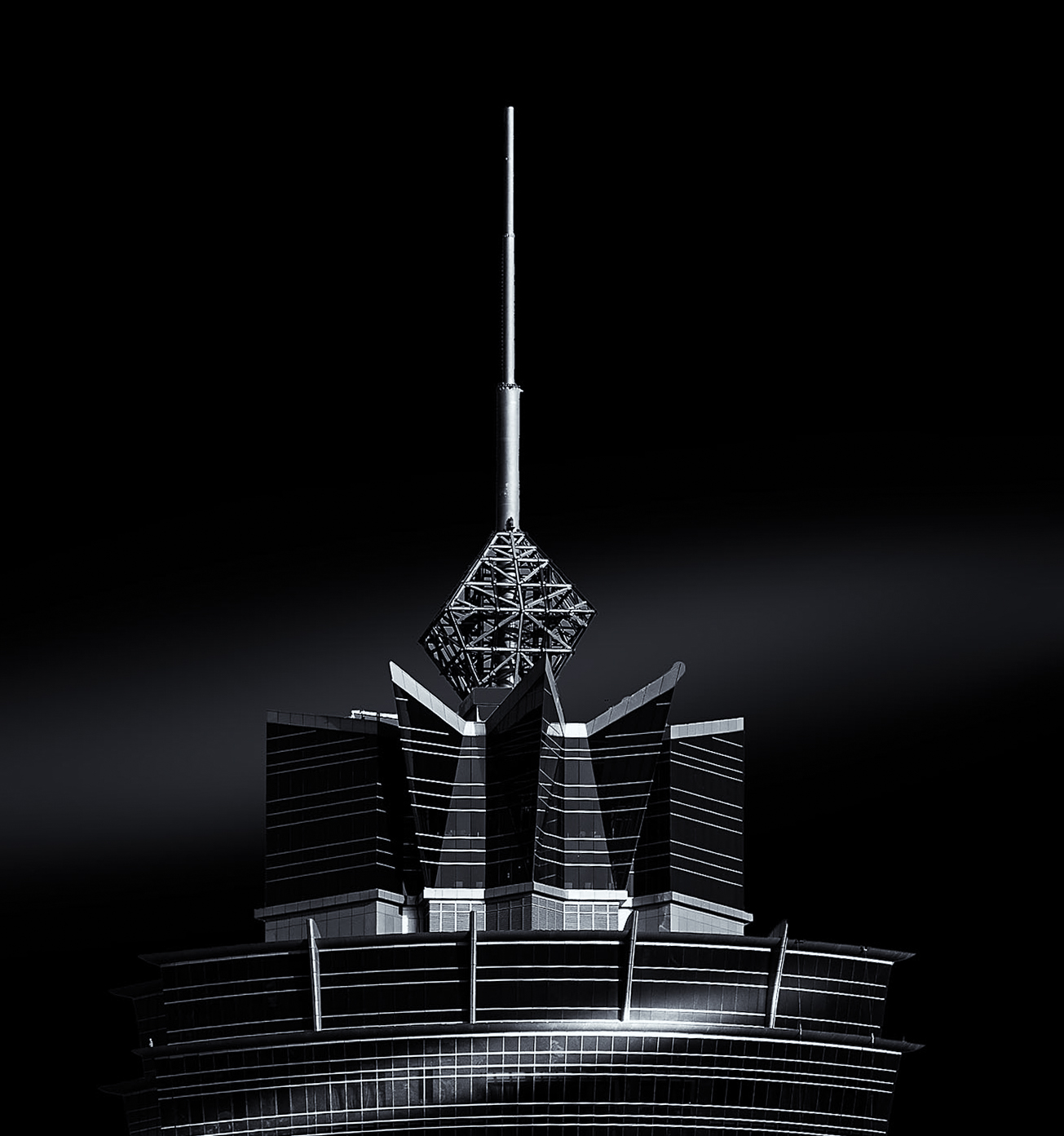 Hi Viren. This is a very dramatic architectural image which I like very much for its simple clean presentation and crisp forms. The black and white works well and emphasizes the lighting and form of the building against the stark backdrop. The diagonal dashes of light are the piece which makes this image stand out against a simple architectural shot.