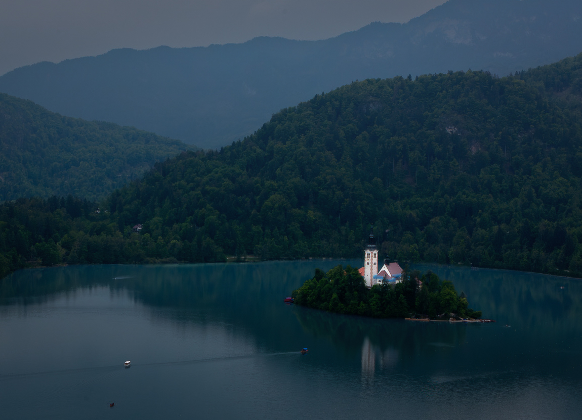 If I were looking to strengthen the image further, I might lean into the rainy, overcast mood. Perhaps darken it down a bit, add a little more haze in the background, darken the bright sky reflections in the foreground, etc. Compositionally I might also take a little off of the left side to improve the balance in the background and to put the lovely little island and its building closer to the third. I'd also lighted that building - it is the star of the show, pushing back against the gloominess. Overall maybe something like the attached.