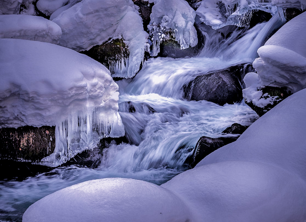Hi Haru. It really does look cold and has a lot of interesting areas to focus on. I think it would benefit from a crop to focus on the stream which to my eyes is the subject. There is a lot of surrounding area that does not add to the story. the image would benefit from a crop similar to what Bob did. Also if your intent is to show cold then adding more blue overall would portray that. The only other suggestion would be to work on the highlights and shadows especially in the stream to create more depth. This is a lovely stream. Where is it if you don't mind me asking. I have attached my quick edit but I may have over done the blue. |