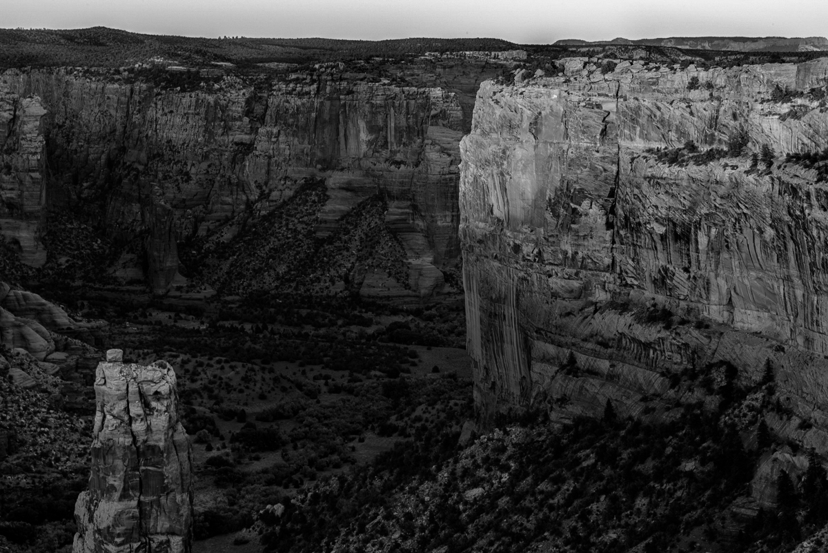 I really like the viewpoint in this image. I really hope to go to an area like this some day. I like your first black and white version better than the second one. The second one seems to have too much contrast and has lost the subtle shades of grey. I think the layers of color in the color version is what draws my eye to the color image. I do however think that the image requires the rocky areas lit by the light to be brighter than the rocks in the valley and behind. This would give the image more depth. I used to truely hate black and white but I have come around to loving the detail that it can bring out in an image like this. I have tried a couple version but I am not sure if they are much improved. The first is my attempt to bring out the bright rocks in the color version and darken the valley and background in an attempt to create more depth |
