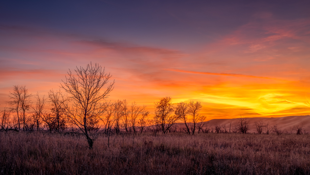 No, just really busy with work and family around Easter this year making me late. I made them moon the size I remember seeing it which is always larger that it appears in my photos. Maybe I went overboard. I chose the vertical aspect ratio because I wanted the moon to balance the bale and to remove what wasn't needed in the image. The moon is at an angle to the bale of a later image that I did take in vertical aspect ratio zoomed in. I liked the angle opposite the bale. The warm coloring came from me trying to bring out the fall colors in the trees at the base of the hills. It wasn't as dark as this image appears. The Sun was just setting behind me (see attached image). I will try a cooler tone and see if that may look better. Thank you so much for the suggestions. |