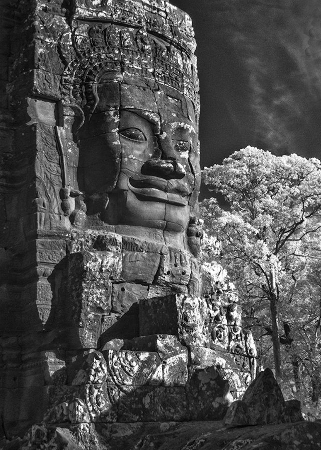 I think that you really have created a fine vision of your own. You have given life to the sculpture - it feels like a strange god had descended on Earth from the dark skies with an enigmatic smile. I think that the infrared was a perfect choice, with the lack of atmospheric haze and the otherworldly bright white foliage. I wonder if it would benefit from darkening the lighter areas at the left edge, and cropping off a little from the top edge with the small triangular notch, and maybe also a little from the bottom edge, to take the attention even more clearly to his wonderful face? |