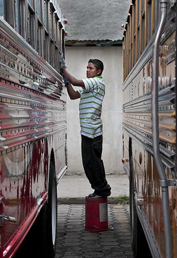 Hi Joan, this is such a clever image with the strict symmetry and the diagonal lines leading the eye to the boy on his bright red bucket. At first glance, it is not clear that it is buses he is cleaning; it could be any shiny high-tech structure. The contrast to the coarse pavement with the tuft of grass is delicious and gives it, I think, a slightly surreal touch. I wonder if your original crop would work, too, and even increase the feeling of symmetry - I painted away the distracting leaves and the wires in the part of sky, and reduced the saturation. What do you think? |