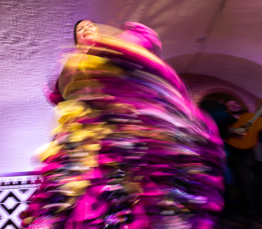 Hi Billy, there she goes in a swirl of the bold colors of her dress! One can hear the music and the tapping of her shoes. I think that the guitar player in the corner is an essential contribution, and love the contrast that the bright gold of his instrument makes with the colors of the dancerÂs dress. However, I think that the bright yellow at the edge tends to draw the eye from the dancer. I tried to darken the color of the guitar a bit and reduce its brightness - what do you think? |