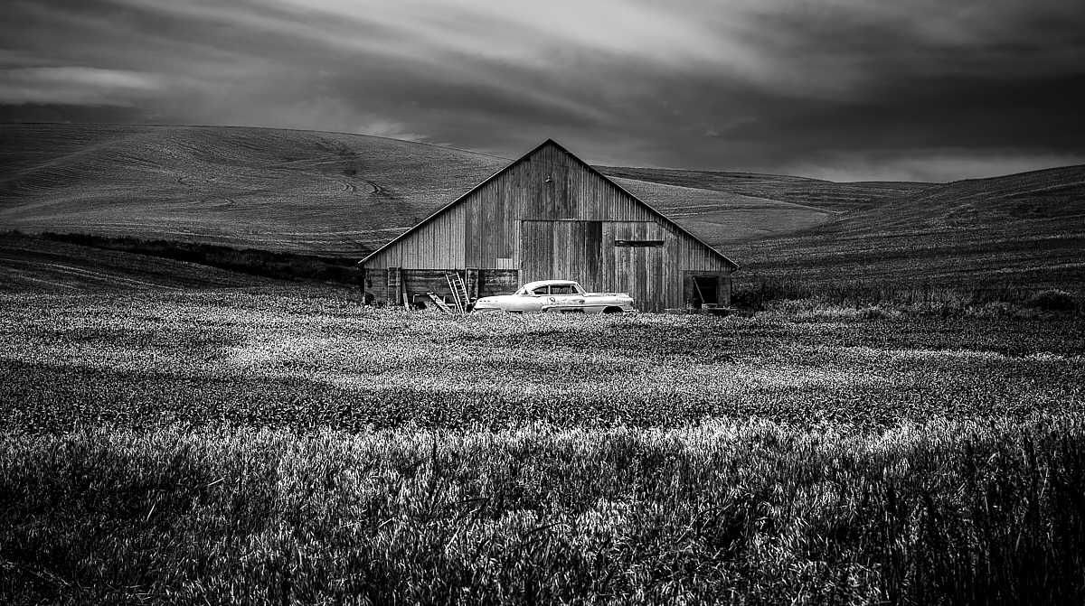 Hi Jeff, there is a lovely desolate atmosphere with the barn and the car in the middle of nowhere under the moody sky, and definitely a story. My favourite is a Bonnie-and-Clyde type hidden get-away car episode. - I think that there are many crops that would work: the original centered composition emphasizes the incongruous sight of a car in such a place, and Al's suggestion would make even more of the loneliness. I think that you could also try to crop off some of the sky (although it would be a pity) to make one feel like wading through the very wide field to reach the car? A wonderful image! |