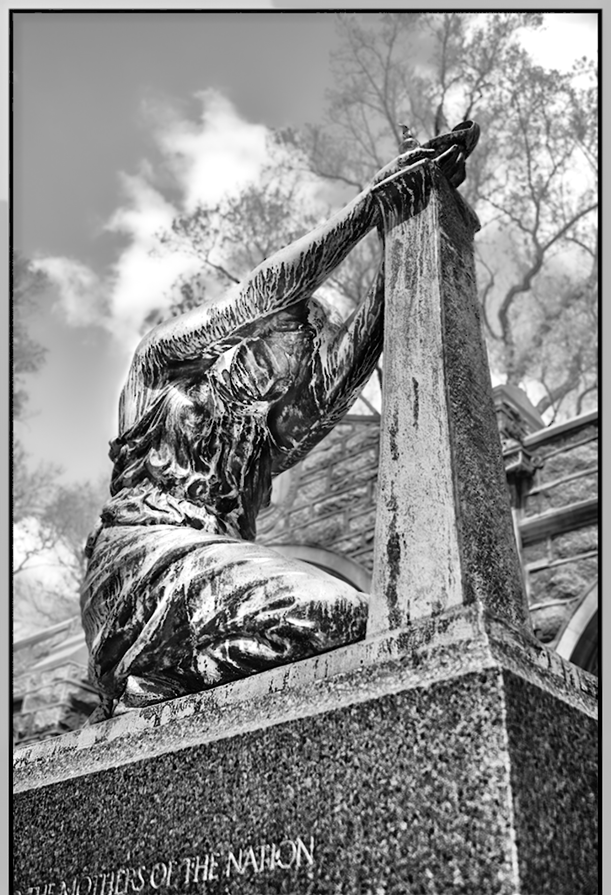 Hi Ed, the image is filled with emotional impact: I think that Al says it all so beautifully. - The original speaks to me more strongly, I think it is the camera angle. I think, like Al, that it would be enough to just subtly blur the background. I made a mask for the sky, trees and the wall in the background, and brought clarity, contrast and structure down, and increased brightness a bit, and made opposite changes for the statue. She shows now darker against the background, but I think that it might emphasize her tragic nature. What do you think? |
