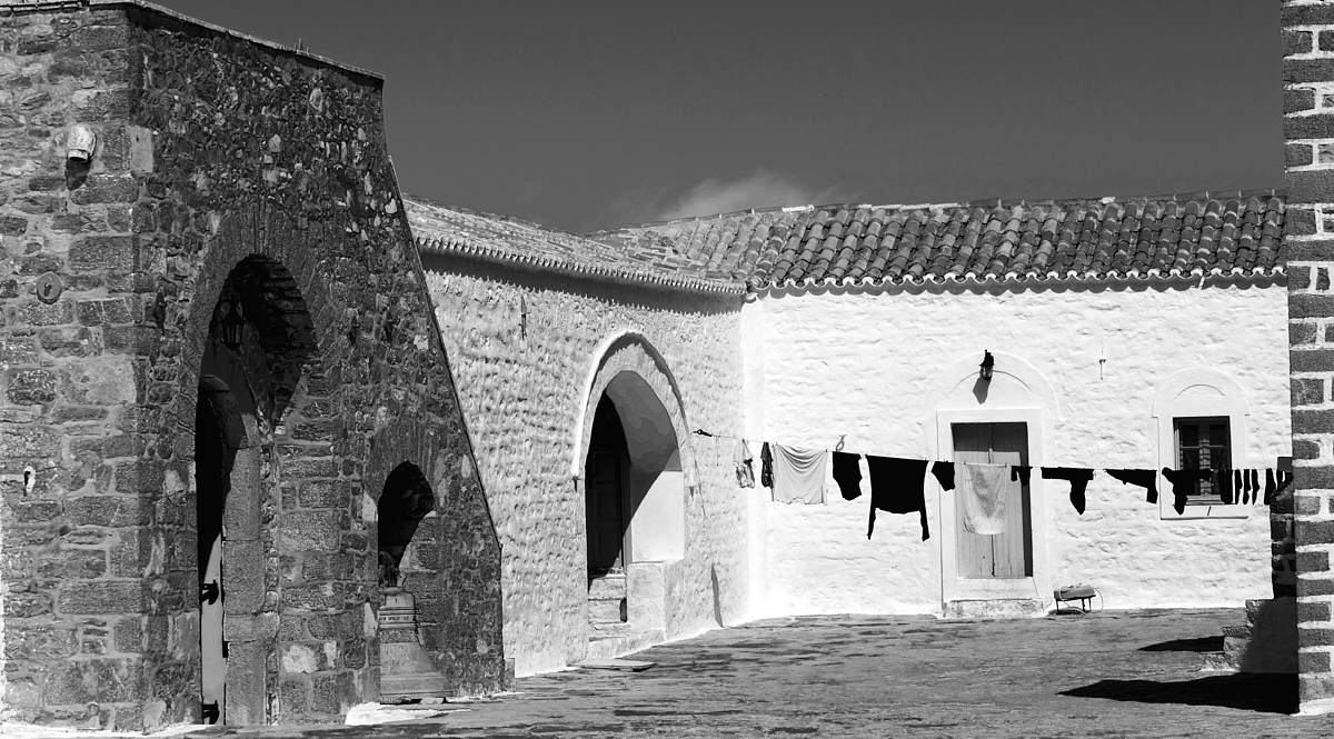 Hi Robert, what wonderful light! I can sense the midday heat reflecting from the brilliantly white wall and the feeling that nothing moves in the yard baking in the sun. The clothesline is a lovely sign of life. - I think that the little bit of brick wall on the right edge kind of forms a frame for the image, balances the structure on the left, and gives an origin point for the shadows, so I like the original crop. - What about applying a gradual ND filter for the sky? |