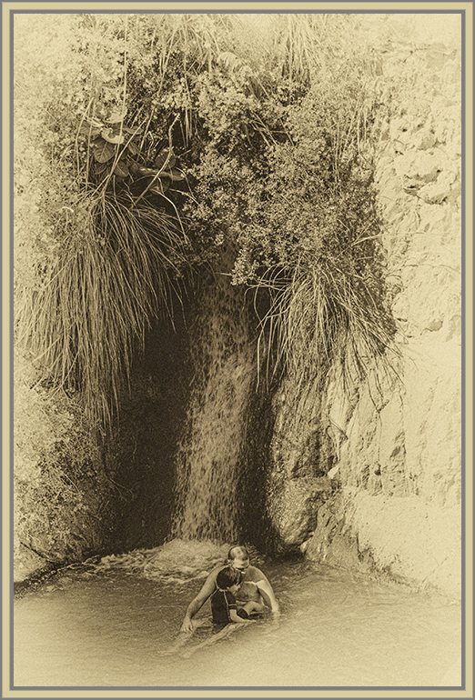 Hi Ed,I tend to have same kind of thoughts as Jeff: I see a perfect moment of closeness, love and trust between parent and child, safe in the sheltered cove in paradise-like scenery. The light vignette emphasizes the feeling that they are like in their own bubble outside time. With the frame and the sepia toning, this could be an old photograph of a cherished childhood memory that somebody carries in his wallet for life. - I wonder if it would be a good idea to remove or darken the three white circles with the black center in the boyÂs shirt? Could there be just a little more brightness in the waterfall although it is in shade? A lovely image! |