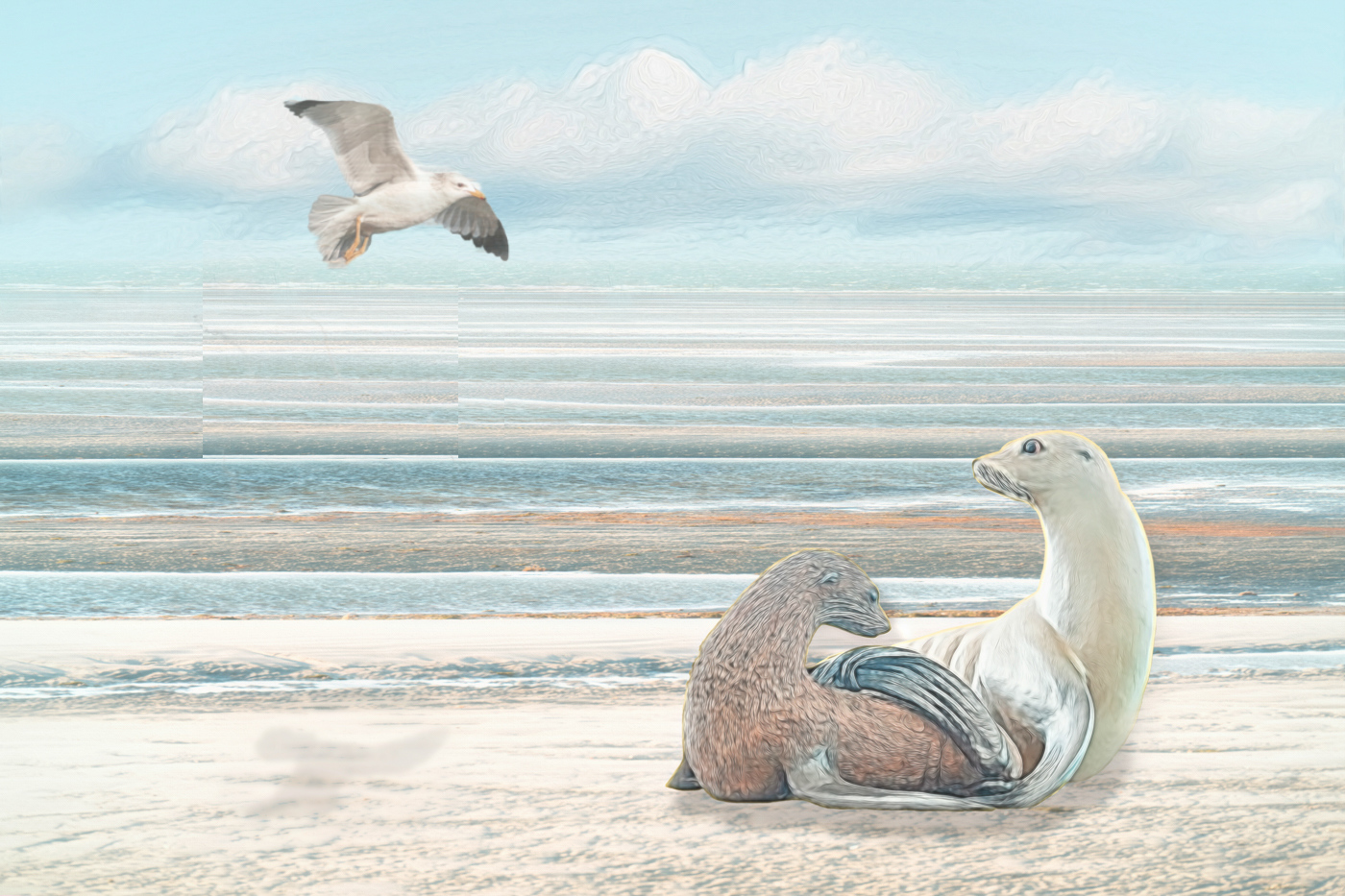 Hi Peggy, I love so your color palette of the subtle luminous orange, yellow and turquoise tones. The light is lovely, and the textures bring out the ripples in the clear shallow water beautifully. It is such a nice scene in a sealÂs life. - I was wondering if the seals looking a little bit more upwards - could the bird be flying slightly higher? What do you think? |