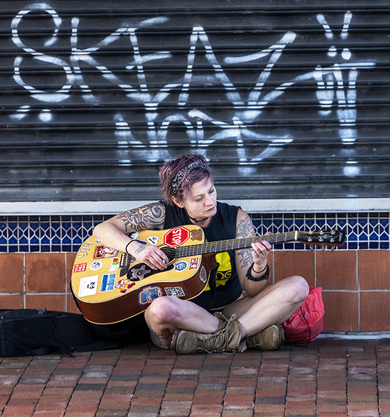 Hi Mervyn, a fine street photo/environmental portrait full of attitude! - I would vote for the tighter crop: I feel that the upper part of the graffiti is so strong with colors and contrast that it may compete for attention with the singer. If you retain the text portion, I think that it would be enough to anchor the image to time and place? |