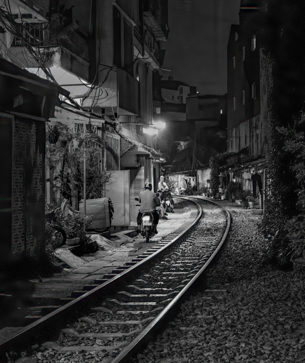 Hi Trung, no wonder that this is your favourite site. It is so exciting and mysterious, and the night scene maybe looks a little dangerous, too. The perspective makes one feel like diving straight into the alley, led by the railway. I love the reflections of the street lights on the rails, and the lights in some of the windows high up in the dark houses complete the atmosphere. The meeting between the biker and the people sitting outside is intriguing - I wonder if you could lighten the group of slightly to make them more clear? And maybe crop off just a little bit of the foreground without affecting the sense of depth? |