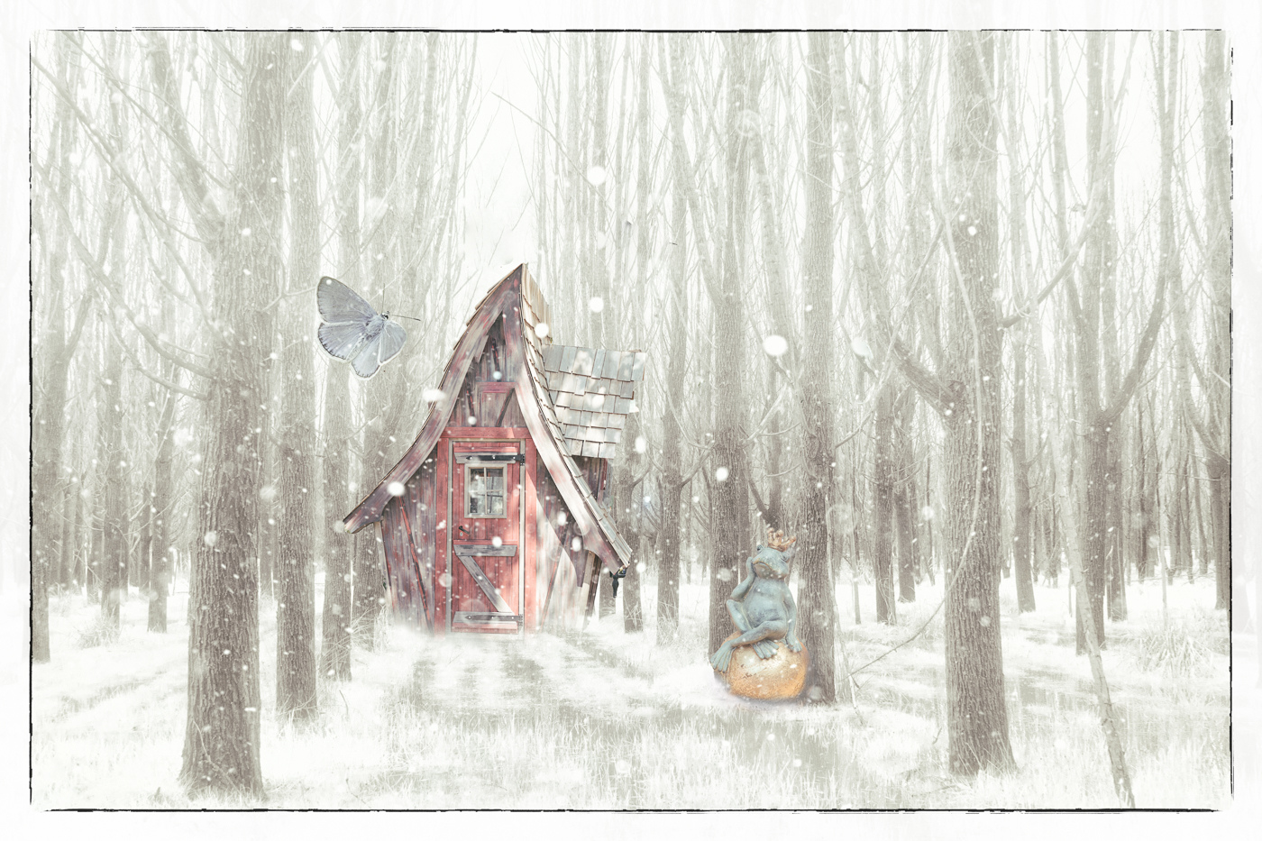 Hi Maria, I think that this is an enchanted scene for many stories to come. It is a loveIy winter landscape as such, and I can see BradÂs children lost in the forest and the lonely wolf there very well, but I fell instantly in love with the sad frog prince. He sits there on the pale gold stone (or is it an egg?) in the falling snow, in front of the empty cottage, waiting. I think that he is looking directly at the big butterfly on the left, with a slightly hopeful expression. What about leaving only that butterfly on the scene? - I love the pale muted tones of the green and gold that make the frog prince fit so well in the scenery. |