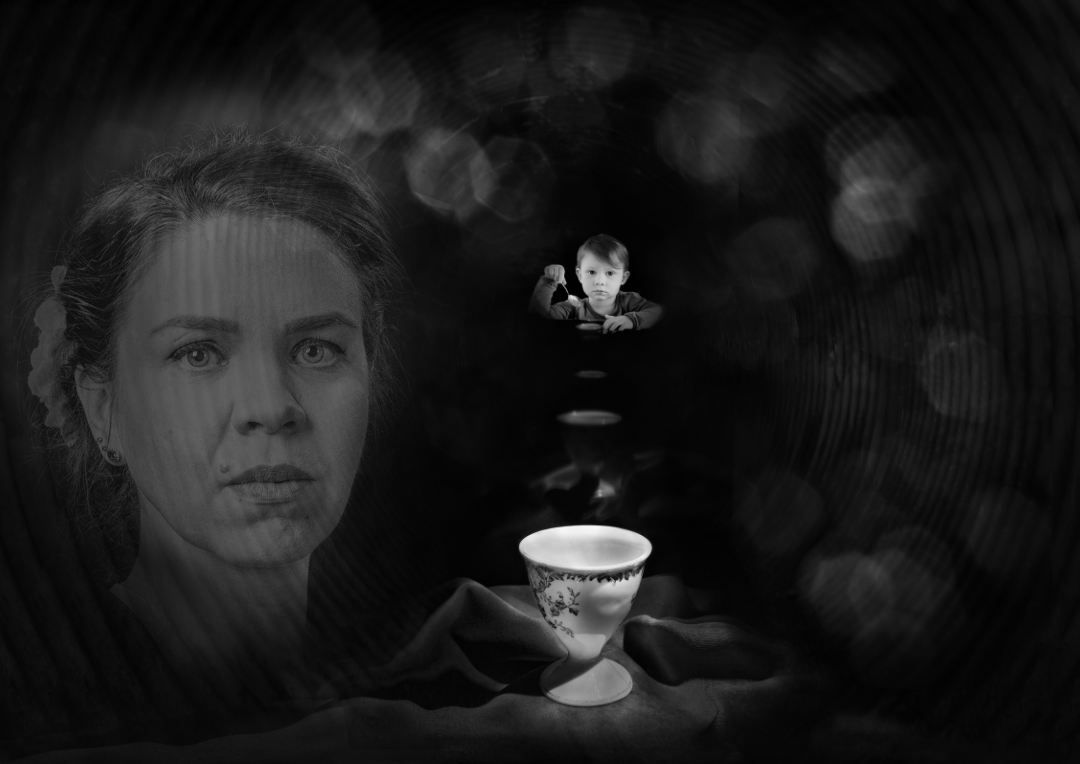 Thank you very much, Maria - I did not notice the difference in the tones at all. Now it is all in neutral black. I added some brightness on the lighter areas of the background - does the egg cup still look too bright? -I enlarged the canvas a bit at the bottom and at both sides to make room for her older self to watch the process from outside the time tunnel, and copied some of the bokeh to balance the empty bright side. What do you think? |