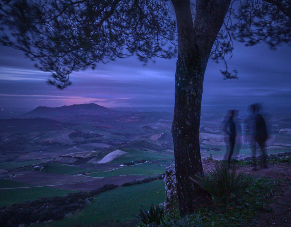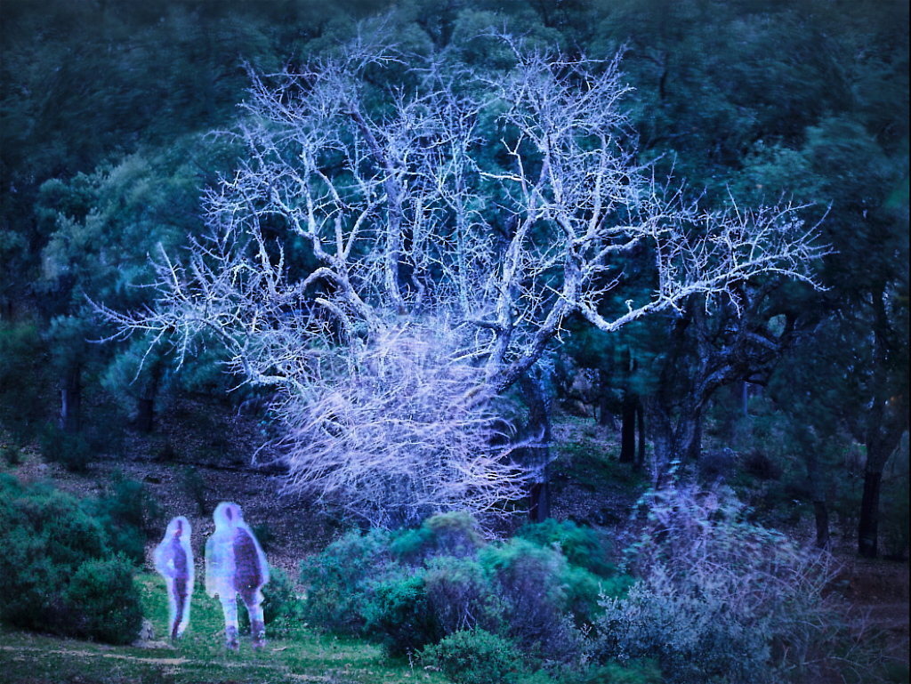 Thank you, Peggy! I like your version. - I started with a Gothic ghost story but turned it into a Star Trek scenario where representatives of the Federation beam up on a planet to hear the complaints of the local life-form. I thought that the purplish glow of the tree, the bush and the characters might suggest that they have something in common and are on the same side? - I think that I may go back to the original idea, too. |