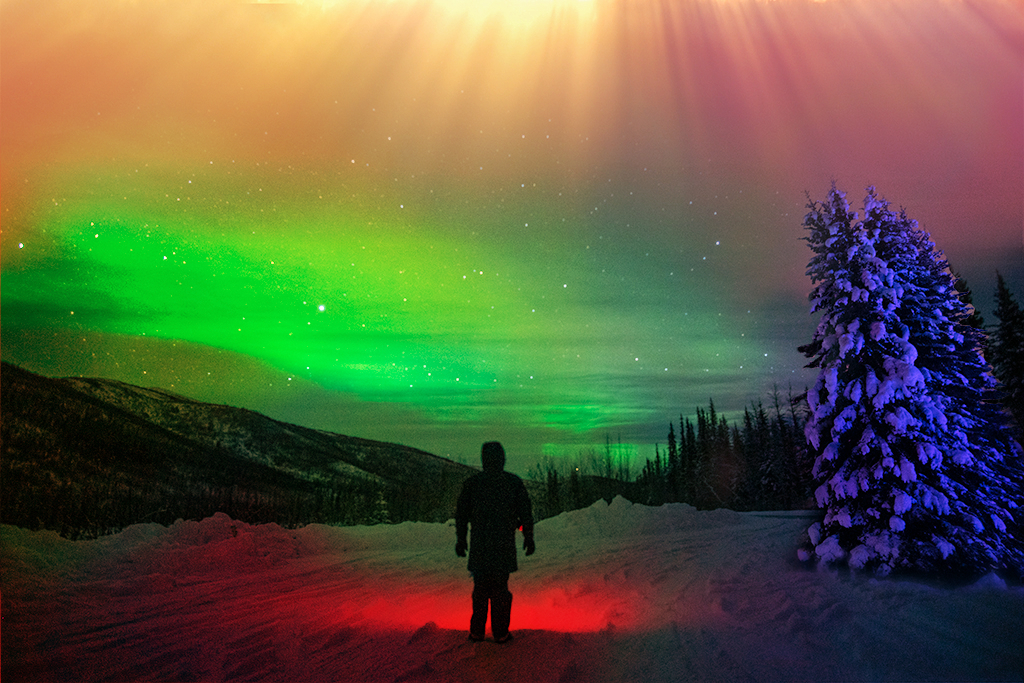 Hi Brad, what an intriguing idea! I think that the background image is a perfect scene to study the lights, with the lonely person in the center of the wilderness under the wide starry sky. The apple-green sky sets the basic color scheme and is effectively complemented by the red sphere in which the subject is standing, and the electric blue/magenta fir trees and the golden light falling from the sky complete your color wheel. - Here is one wild idea: I thought that it might be fun to emphasize the various colors of the light and their blending into each other. I made radial gradient fill layers with colors picked from the sky and the fir trees, from the top and right edge, respectively, and a radial gradient fill layer for the red, and erased parts of them from the center. What about "Tuned" for a title ? I think that it might describe the subject absorbed in the lovely wavelengths. |