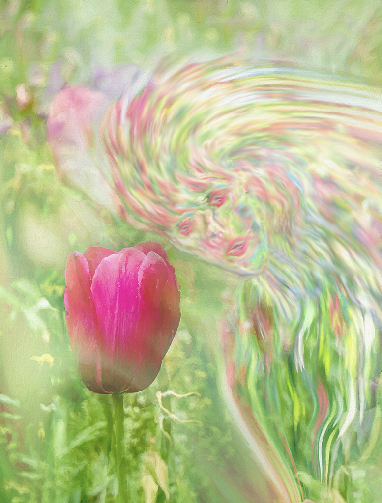 Hi Peggy, I love your Spirit and the way she was born from a burst of flowers and light. - The colors that blend so softly in her body made me think that the narrower lines that form her face and hair might perhaps meld into each other a little more softly, too, for a more ethereal quality. I tried to apply the Smudge tool in Affinity with a small brush and low strength to those parts to demonstrate the idea. What do you think? |