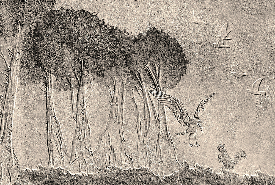 Hi Peggy, I can feel the moment when the images in the sand came alive for you. I love the way you continued the relief look started by Nature with the embossed elements that fit in seamlessly. The postures and placing of the squirrel and the landing bird create such an intense moment that I cannot wait the bird get close enough to start talking. The tangled trees and the foreground with that bright rim give a lovely depth to the scene. - I think that monochrome is a perfect choice, and I like the warm tone. I wonder if reducing the saturation just a little bit, or lifting the darker tones just slightly would give it more air? - but that is but a matter of taste. |