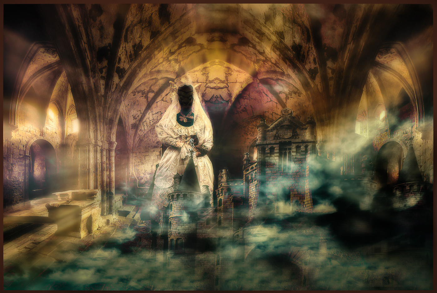Hi Maria, what a marvelous subterranean court you have created! I think that there is an underwater feel with the lighting effects and the aqua tones that compliment the warm earth colors. - I was wondering about the mistress of the palace: I think that her face may get lost in the rich background. What about using just the faceless original? It would make a more ghost-like figure but I think that it might bring her out better, and also fit in the Gothic atmosphere? -I also tried to lighten her gown and immediate surroundings slightly with the Dodge brush. What do you think? |
