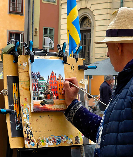 what a nice travel photo - it makes the painting you bought extra special to have its history documented in this way. The background anchors it to time and place, and I love the way you show the artist absorbed in his work. I think that an alternative crop might direct attention even more to the creative process, still retaining enough of the surroundings, although you would lose the pallet, the tin and the brushes? |