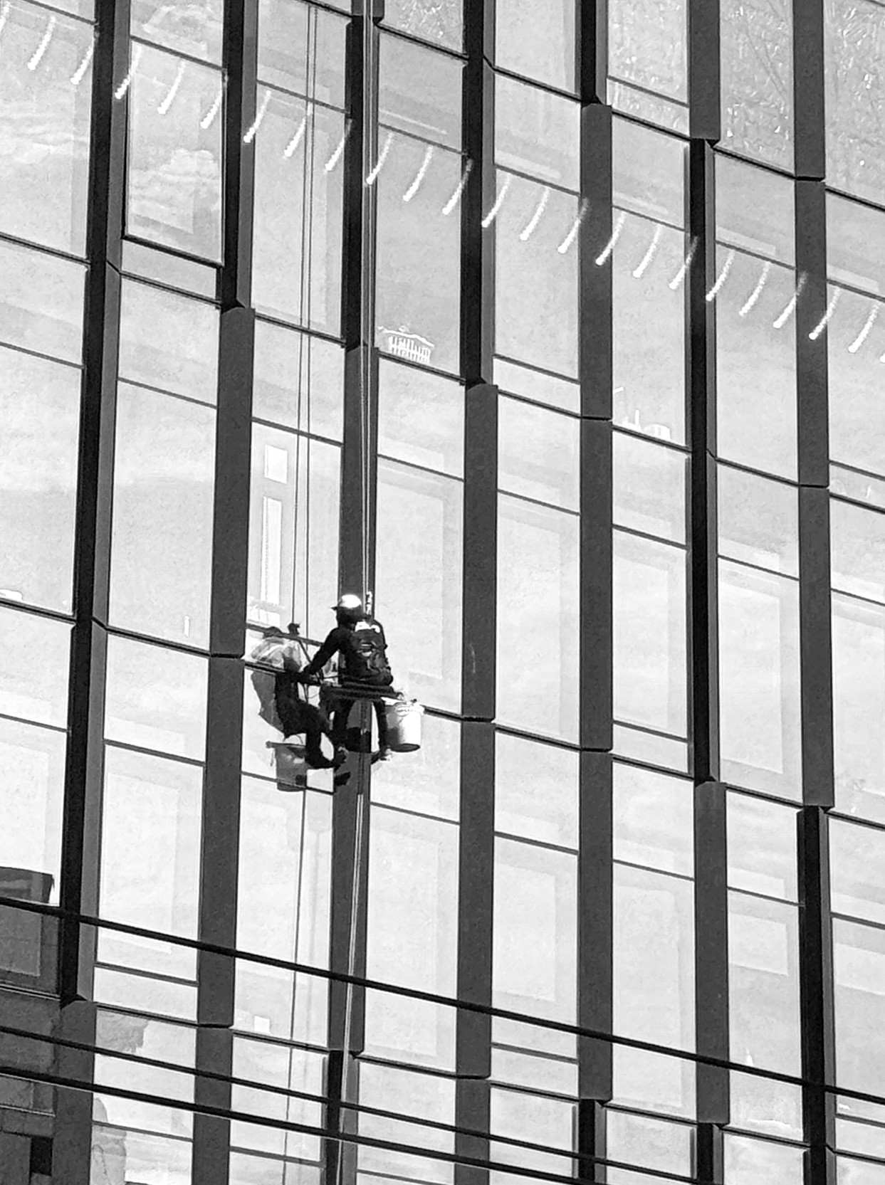 Hi Robert, what a lucky capture! I think that the many diagonals and the chain of reflected lights (?) as well as the slightly tilted perspective add an exciting sense of motion to the image. - I wonder if placing the brave worker a little bit below half-way and making the image narrower might enhance the feeling of height? I'll attach a suggestion of an alternative crop. What do you think? |