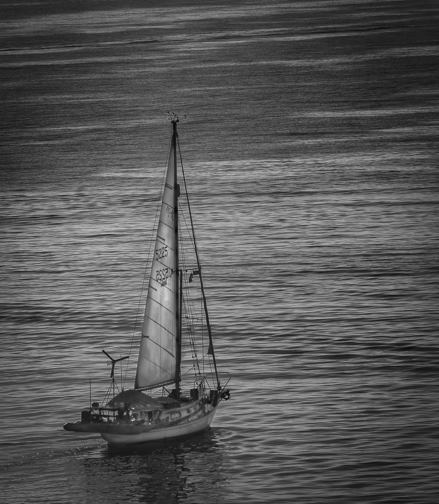 With this image, I agree that black-and-white was probably the stronger choice, as you say the original was close to monochrome to start with and there is detail in the boat itself. If it was my image I would have tried to feature the boat as the brighter object and tone down the background ocean, to my eye the current tonal balance looks neutral. I took the liberty and had a play with this image thinking it had high potential for a lovely black-and-white shot. My attached image is a quick attempt at trying to depict my thoughts and there is still a fair bit of work to bring the detail of the boat out. I particularly like the contrasting lines of the wind generator and the lines and rigging on the boat itself and there is also probably work that could be done on the shadowed reflection as well, maybe slightly contrasting that a bit more. I've attached my image as I stated it is only a first attempt to depict my thoughts on what could happen. Well captured image |