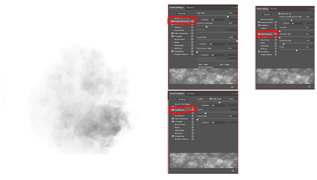 Hi Ingred thank you for that and very willing to share the brush. although I am a player in photoshop, not a strict process person, the attached is similar to the brush I used if not exactly the same. I can send the brush via Darcy and ask her to forward it to you or see attached image. The white square is the brush and there are many youtube instructions on how to create a brush, albeit it took me a while to get my head around it. However, the settings are more important. On the attached image I have copied the settings I used, playing with the various sliders will produce different results in the preview screen. also, the size and opacity of the brush are factors. I do hope that helps and if you want a better description or the actual brush let me know. I can send it via Darcy or you if you provide an email. my email brassil@optusnet.com.au |