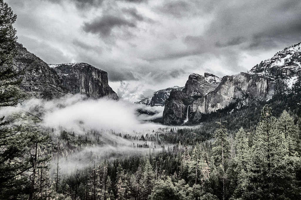 Cheryl - I am thoroughly enjoying your adventures into B&W conversion. For this particular image, I think you choose well since the clouds and trees are so nicely apart in tonality. I like the composition for several aspects: the left tree frame, the descending mountain tops on both sides drawing the eye down to the "tunnel", the sweep of the tree lines on the right that mimic the mountain, and somehow I see balance in the left to right with the low cloud reflected in the hole formed by its absence (does that make sense?).