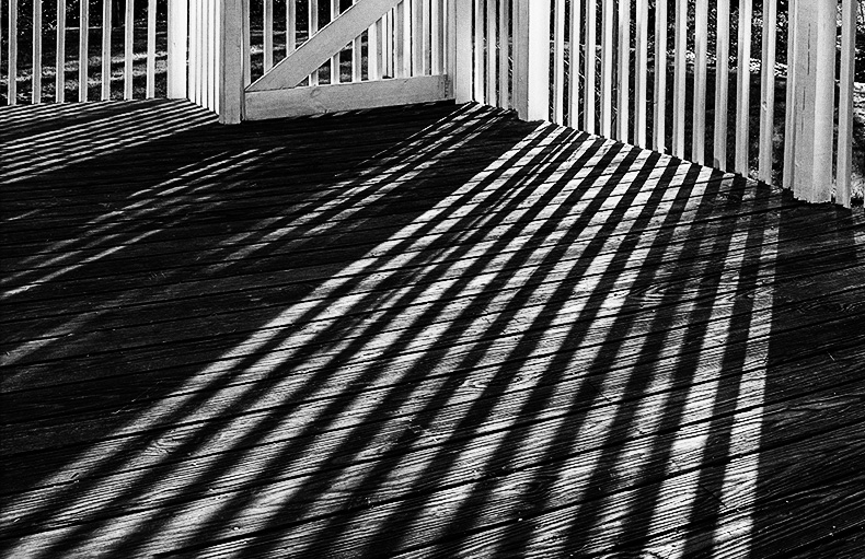 Lines by shadow: I think this is a well chosen, classic B&W subject improved to my way of thinking by the intersection of the shadows by the lines of the textured boards of the deck. Then to complete the picture, the shadow lines transform in both direction and tone as they extend into the bars of the fence.