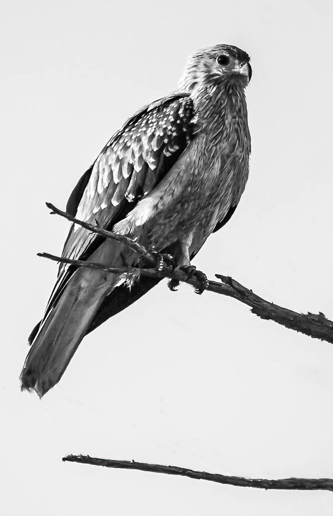 For me the branch on the right is less clear. I see the attraction of the V of the branch - and I also like the flip that Barbara suggests in that it makes the lower branch seem to me to almost be a shadow of the upper. However, I would simply cut out the right side to bring emphasis to the bird's texture and I would keep the lower branch since it seems here to add height to the "watcher" which for me adds to the narrative. |